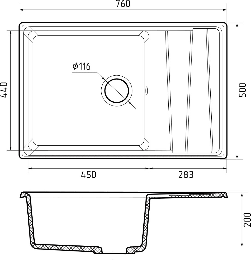 Мойка для кухни GranFest GF-LV-760L - благодаря продуманной эргономике и оригинальному дизайнерскому решению крыла ее можно установить в шкаф шириной 600 мм. Дизайнерскую модель отличают большая практичная чаша размером 450*440 мм, и глубиной 200 мм, которая с легкостью позволит разместить внутри крупногабаритную посуду и промывать ее без лишних усилий. Игра плоскостей на функциональном крыле помогает удобно расположить уже вымытую посуду, чтобы с нее стекала вода. Броская, оригинальная коллекция LEVEL выполнена в очень запоминающейся стилистике, которую во многом поддерживает необычный 3d рельеф на крыле. Трёхмерный рисунок похож на плавно перетекающие друг в друга ступени.