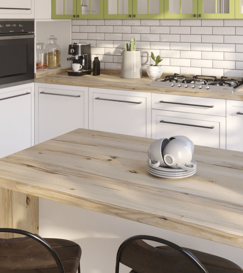 Светлый и солнечный Тирольский Бук позволяет проявить фантазию в выборе фасадов и корпусов кухни, добавить яркие аксессуары, наполнив интерьер индивидуальностью.