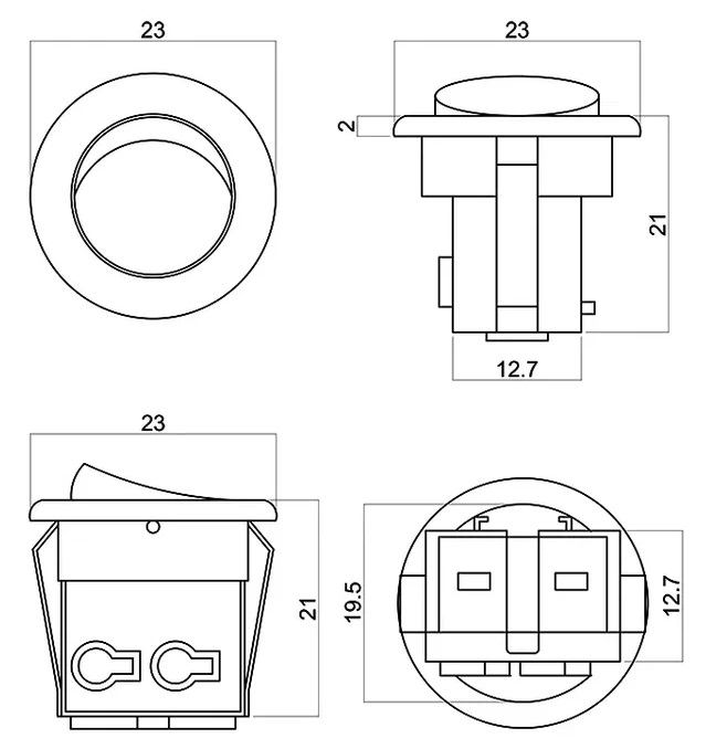 Выключатель D23 запрессовывается в отверстие диаметром 25мм, сделанное в ДСП, ДВП или другом аналогичном материале, из которого изготовлена мебель. Подсоединение проводов к выключателю – пружинные терминалы. Максимальное коммутируемое напряжение – 250В, ток –до 6А.